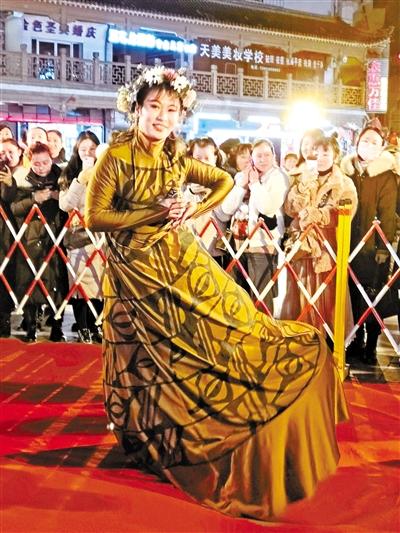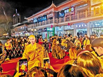 當(dāng)晚7時(shí)許,途經(jīng)表演現(xiàn)場(chǎng)的人流從四面八方聚攏于此,人們頻頻舉起手機(jī)將鏡頭對(duì)向眼前裙袂飛揚(yáng)、舞姿優(yōu)美的“大地灣女神”和頷首微笑、靜若處子的“東方微笑”,一時(shí)間,閃光燈忽明忽暗此起彼伏,行人你來(lái)我往人聲鼎沸,步行街頃刻間歡聲笑語(yǔ)、熱鬧非凡。記者發(fā)現(xiàn),扮作“不倒翁”的“女神”模仿大地灣出土的人頭瓶外部特征,而一旁采用懸浮藝術(shù)呈現(xiàn)的“小沙彌”,打禪靜坐、頷首微笑。
