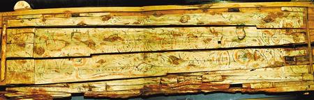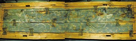 1998年新城魏晉南墓出土。這副完整的木棺由棺身和棺蓋組成,棺蓋內側有一長方形凹面,內彩繪伏羲女媧圖。伏羲女媧人首蛇身,兩尾相交,伏羲在右,左手執(zhí)矩,女媧在左,右手執(zhí)規(guī)。伏羲女媧周圍飾云氣紋。棺身呈長方體,兩檔頭用墨線勾畫星象圖,棺內側四壁彩繪幃帳、絹帛、蠶繭等圖形。