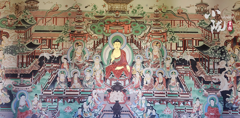 近日,一副長15米、高6米的大型臨摹復(fù)制敦煌壁畫《無量壽經(jīng)變》在武威鳩摩羅什寺完美竣工,將于近期對外開放。