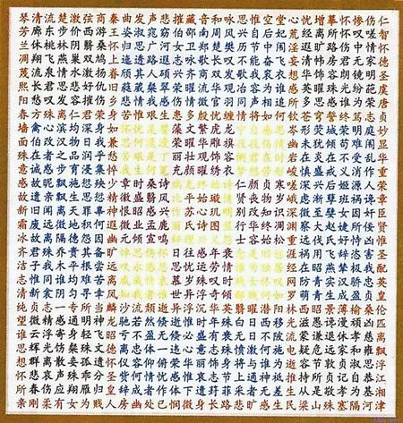 《璇璣圖》用五彩絲織成,橫豎各29字,錦方八寸,順讀、回讀、橫讀、斜讀、交互讀、蛇行讀、退一字讀、重一字讀、間一句讀、左右旋讀,皆成詩章。結(jié)構(gòu)不同,但主題不離閨怨。從中能婉轉(zhuǎn)讀出數(shù)百乃至幾千首詩,真是奇妙至極。再引用武則天的話來說,它“五采相宣,瑩心耀目”“題詩二百余首”,共計(jì)八百余字??v橫反復(fù),皆成章句。其文點(diǎn)畫無缺,才情之妙,超古邁今,名《璇璣圖》。圖剛織出,一般人看了,都讀不懂。蘇蕙笑對人說:“徘徊宛轉(zhuǎn),自成文章。非我佳(家)人(指竇滔),莫之能解。”于是讓家仆將《璇璣圖》送到襄陽。竇滔看了,果然感慨其寫得無比絕妙,立即回心轉(zhuǎn)意,備上車輛厚禮,接蘇蕙到漢南任所,二人“恩好愈重”。武則天所作《蘇氏織錦回文記》還提到,蘇蕙前后著文詞五千余字,遭隋末喪亂,文字散落,尋求不獲。“而錦字回文,盛見傳寫。”它是閨怨詩的范文,最早的傳世回文詩。(李昉等編《文苑英華》卷834)評價極高,贊不絕口。難怪后人將蘇蕙與蔡文姬、謝道韞、左棻并列,為魏晉十六國四大才女之一。