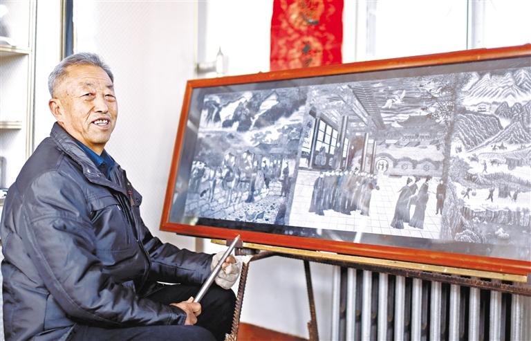 接下來就是耗費工時與體力的制作過程,“每天創(chuàng)作雕刻都在三四個小時,每分鐘在刻板的敲擊次數(shù)達(dá)到近200次,每小時敲擊次數(shù)達(dá)到8000-12000次,9大板塊在創(chuàng)作過程中就要敲擊近16億次點,每個板塊耗時10-11個月,9大板塊共耗時3000多天。”陶世清細(xì)數(shù)著創(chuàng)作的艱辛。