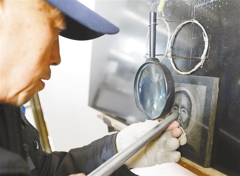 在大理石板上雕刻,是傳統(tǒng)手工技藝影雕的一種。這種雕刻方式采用墨玉、山西黑等純色石材,經(jīng)過水磨拋光后,在磨光面上要把雕琢的圖像輪廓描繪出來,根據(jù)黑白明暗成像原理,用特制的像針一樣細(xì)小的合金鋼頭工具,通過運用腕力調(diào)節(jié)針點疏密粗細(xì)、深淺和虛實線變化而表現(xiàn)圖像。