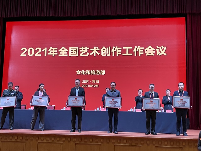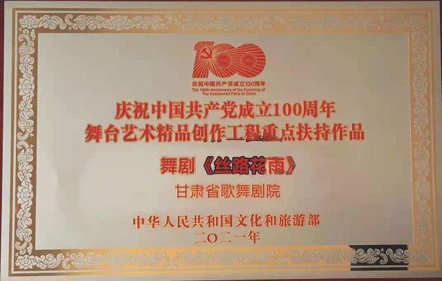 中國甘肅網(wǎng)12月19日訊 12月18日,文化和旅游部在山東省青島市召開的“2021年全國藝術(shù)創(chuàng)作工作會議”上,發(fā)布了“慶祝中國共產(chǎn)黨成立100周年舞臺藝術(shù)精品創(chuàng)作工程”入選名單,頒發(fā)了“慶祝中國共產(chǎn)黨成立100周年舞臺藝術(shù)精品創(chuàng)作工程獎牌”。甘肅省文化和旅游廳遴選推薦的舞劇《絲路花雨》《大夢敦煌》《彩虹之路》、隴劇《官鵝情歌》、小品《你笑起來真好看》等5部舞臺藝術(shù)精品,經(jīng)文旅部評審正式入選“舞臺藝術(shù)精品創(chuàng)作工程重點扶持作品”。甘肅省歌舞劇院創(chuàng)排的舞劇《絲路花雨》作為12家“百年百部”工程受獎單位在全國藝術(shù)創(chuàng)作工作會議上接受獎牌和榮譽證書,甘肅省文旅廳、山東省文旅廳等參會代表12家領(lǐng)獎單位上臺領(lǐng)獎,充分展現(xiàn)了文旅部對甘肅省入選作品質(zhì)量及組織工作的高度肯定。