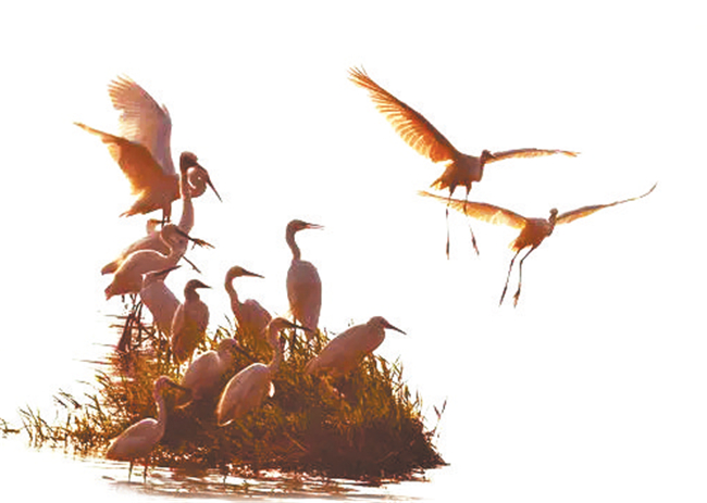 去年12月底,一位老師來(lái)西峰講學(xué),我陪先生到濕地海綿公園轉(zhuǎn)悠,剛剛步入人行道,發(fā)現(xiàn)遠(yuǎn)處湖水中央有七八只白鷺在棲息,朝陽(yáng)斜射到湖面上,水波瀲滟,像細(xì)碎的金斑,白鷺安詳?shù)叵礈熘鹈幸恢话槅瓮戎绷⒅?,恰似依著一根筆直纖細(xì)的鐵絲,半張著翅膀,欲飛不飛的樣子,剩下的幾只白鷺在戲水,迷人極了。