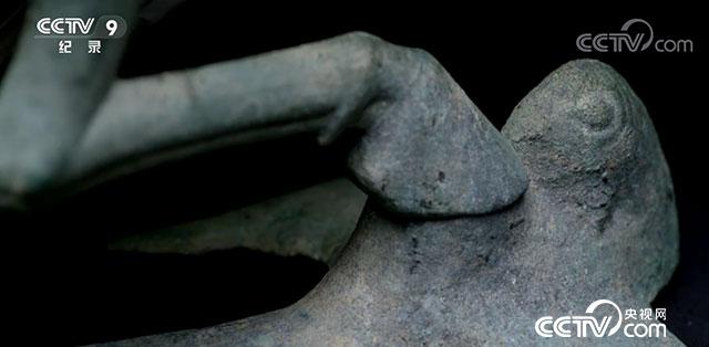 我整器由馬與飛鳥構(gòu)成,一匹正在急速飛奔的駿馬,身高34.5厘米,身長(zhǎng)45厘米,全身呈流線型,肌肉健碩有力。馬的三足騰躍在空中,一足踏上飛鳥。飛鳥不知后面追上來的是什么,驚回首的一剎那間,馬已經(jīng)超在了前面,這馬踏飛燕(馬超龍雀)夢(mèng)幻般的瞬間被定格成為永恒。