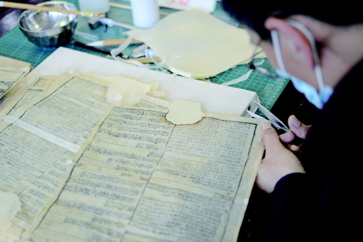 古籍部主任李東暉介紹,古籍破損的原因很多,歸納起來(lái)大致有蟲蛀鼠嚙、霉蝕、酸化、老化、使用中的磨損等。針對(duì)不同的“病因”,古籍修復(fù)師都要制訂不同的修補(bǔ)方案。古籍修復(fù)有兩種方法,一種是全手工修復(fù),另一種是使用紙漿補(bǔ)孔設(shè)備修復(fù)。全手工修復(fù)需要選擇配紙、修補(bǔ)破洞、壓平處理、搓紙捻釘、理齊、打眼、復(fù)原裝訂成冊(cè)等工序。紙漿補(bǔ)孔機(jī)修復(fù)一般適用于蟲蛀破損嚴(yán)重的古籍。面對(duì)一些破損嚴(yán)重的古籍,將粘連的古籍分頁(yè)也絕非易事,得使用“干揭”“濕揭”“蒸揭”等手法。