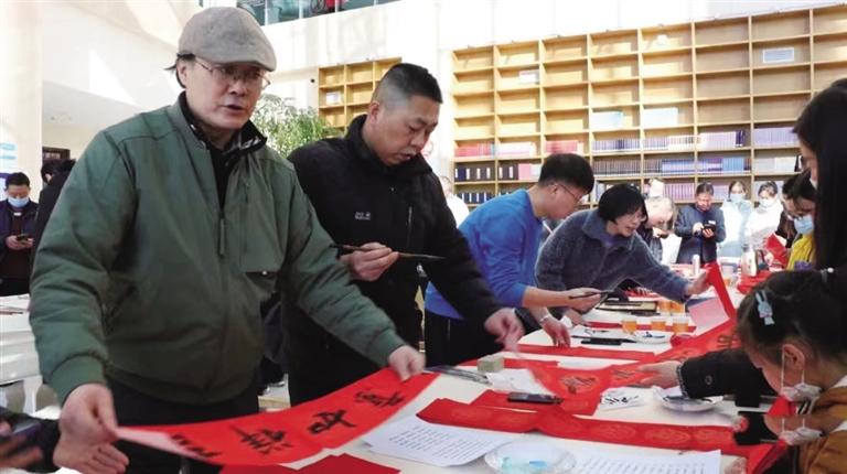 活動中,蘭州畫院和市文化館的10余位書畫家提筆蘸墨、盡情揮毫,為新區(qū)圖書館精心創(chuàng)作了美術作品,并為聞訊趕來的眾多新區(qū)居民現場書寫了寓意吉祥的春聯和“福”字近400套(幅),在春節(jié)來臨之際為他們送上了美好的祝愿。