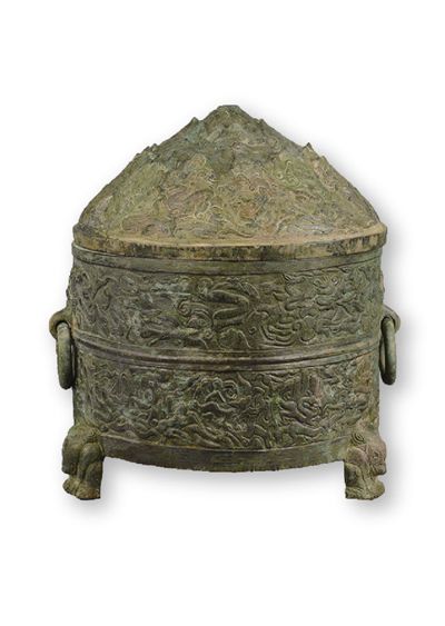 樽為古代盛酒的器具。李白《行路難》云:“金樽清酒斗十千,玉盤珍羞直萬錢。”考古發(fā)現(xiàn)的酒樽最早出現(xiàn)在戰(zhàn)國時期,漢代酒樽常與杓、承盤等酒具配套使用。此件銅樽裝飾紋飾繁縟華麗,制作工藝精湛細膩,是東漢青銅冶煉技術(shù)的杰出代表。