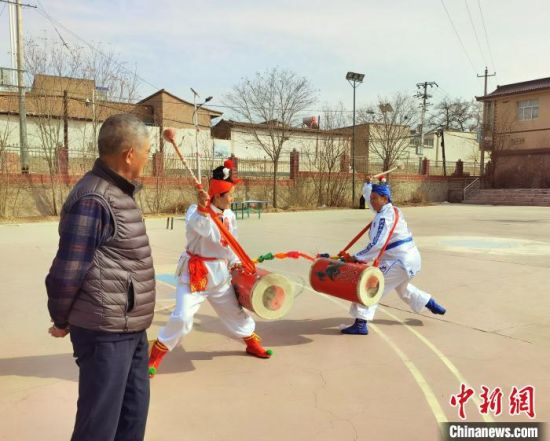 春寒料峭,中新網(wǎng)記者走進(jìn)蘭州市榆中縣金崖鎮(zhèn)陸家崖村,帶隊女子太平鼓隊近30年的陸鵬飛指導(dǎo)隊員訓(xùn)練。 張婧 攝