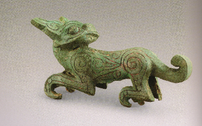 禮縣大堡子山祭祀樂器坑出土,共三只,造型相同,大小相似,為全國虎伴樂器出土的首例。其形象回首卷尾、聳耳曲爪、憨態(tài)可掬,極具觀賞性,是春秋時期虎造型的杰作,體現(xiàn)了秦國早期高超的造型能力和精湛的鑄造技術(shù)。虎的形象在春秋秦人的器物中多見,不但有自成個體的金虎、青銅回首虎,同時虎作為附飾也出現(xiàn)在一些大的青銅器上。