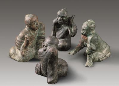 四俑相向跪坐,身著漢代最常見的高領(lǐng)衣服。二人頭頂盤挽發(fā)髻,二人以寬巾裹首。坐姿不同,形態(tài)各異,最為精彩有趣的是四俑的面部表情,或喜笑顏開,或怒不可遏,或凝神沉思,或憂傷悲愁。