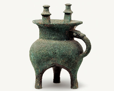 分襠三足,束腰雙柱,牛首鋬,素面,頸部飾弦紋。鋬內(nèi)族徽下有銘文。