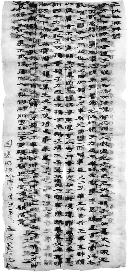 子方足下,善毋恙!苦道子方發(fā),元失候不侍駕,有死罪。丈人、家室、兒子毋恙,元伏地愿子方毋憂。丈人、家室元不敢忽驕,知事在庫,元謹(jǐn)奉教。暑時(shí)元伏地愿子方適衣、幸酒食、察事,幸甚!謹(jǐn)?shù)溃簳?huì)元當(dāng)從屯敦煌,乏沓,子方所知也。元不自外,愿子方幸為元買沓一兩,絹韋,長(zhǎng)尺二寸;筆五枚,善者,元幸甚。錢請(qǐng)以便屬舍,不敢負(fù)。愿子方幸留意,沓欲得其厚、可以步行者。子方知元數(shù)煩擾,難為沓。幸甚幸甚!所因子方進(jìn)記差次孺者,愿子方發(fā)過次孺舍,求報(bào)。次孺不在,見次孺夫人容君求報(bào),幸甚,伏地再拜子方足下!所幸為買沓者,愿以屬先來吏,使得及事,幸甚。元伏地再拜再拜!