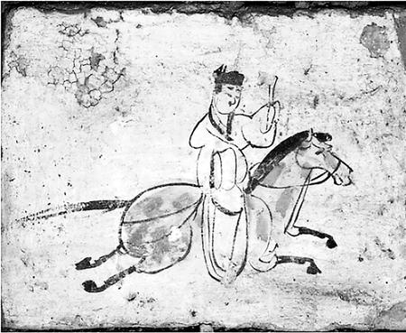 這一時(shí)期,自天子以至百官士庶,除乘車(chē)外還普遍騎馬。西晉時(shí)北方出現(xiàn)上馬時(shí)所踩的單馬鐙,南北朝后期又出現(xiàn)嚴(yán)格意義上的雙馬鐙。馬鐙的使用能減輕人們騎馬的體力消耗,有利于控制馬匹。這一時(shí)代的低級(jí)官員和百姓出行還乘驢、騾,甘肅等西北地區(qū)少數(shù)民族多乘駝,運(yùn)載貨物主要用牛車(chē)。漢地民眾出行,仍然是安步當(dāng)車(chē)。嘉峪關(guān)魏晉墓五號(hào)墓的《驛使圖》,畫(huà)面中一個(gè)郵驛使騎在馬上,頭戴進(jìn)賢冠,身穿右襟寬袖衣,足蹬長(zhǎng)靴,左手舉木牘文書(shū),右手持馬韁,驛騎四蹄騰空,飛奔直前。這幅畫(huà)再現(xiàn)了當(dāng)時(shí)甘肅地區(qū)驛使馳送文書(shū)的情景,也是我國(guó)古代郵驛使較早的形象資料。