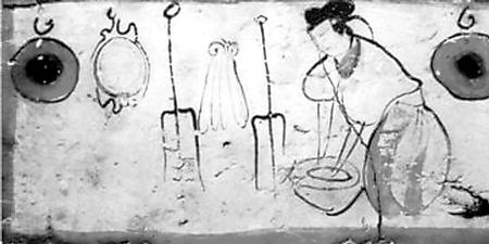 糧食、蔬菜品種與前代相比沒(méi)有大的變化,仍是漢地人的主要經(jīng)濟(jì)和衣食來(lái)源。烹飪方法,這一時(shí)期出現(xiàn)了面粉發(fā)酵技術(shù)。北魏賈思勰介紹發(fā)面技術(shù)說(shuō):“面一石,白米七八升作粥,以白酒六七升酵中,著火上,酒魚(yú)眼沸,絞去滓,以和面,面起可作”(《齊民要術(shù)》卷9)。把北魏時(shí)期的容量數(shù)換算成今天的市斤,上段話(huà)的意思就是,用五十多斤面粉,五六斤白米做粥,再用四五斤白酒(甜米酒)做酵母,將酒架火上燒至發(fā)出魚(yú)眼樣的小泡后,濾去酒渣,加入面粥中發(fā)酵,等面發(fā)起后就可以做餅了。這是一項(xiàng)歷史性的烹飪技術(shù)。從發(fā)面的數(shù)量看,一次發(fā)這樣多面的家庭,至少有三五十口人,顯然是當(dāng)時(shí)世家大族的人口規(guī)模。世族如此,普通民眾也應(yīng)很快就學(xué)習(xí)掌握了發(fā)面技術(shù)。
