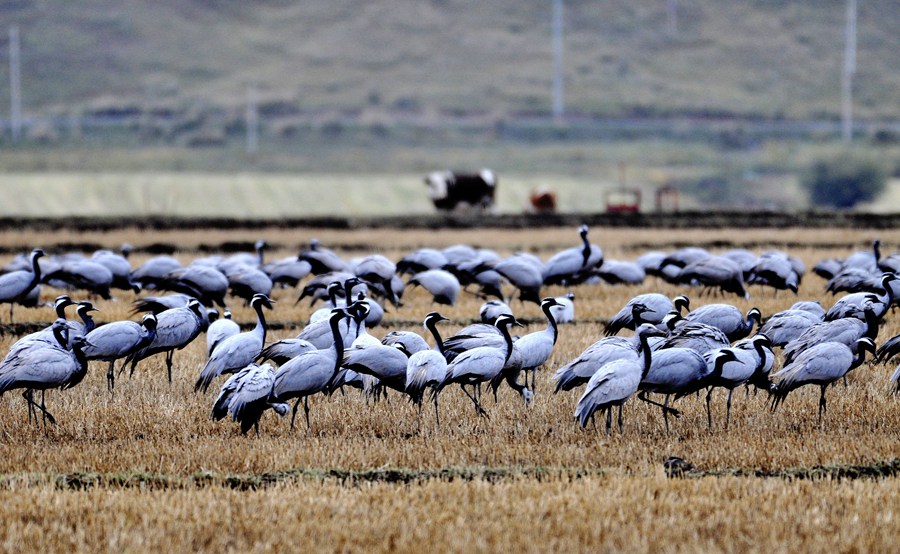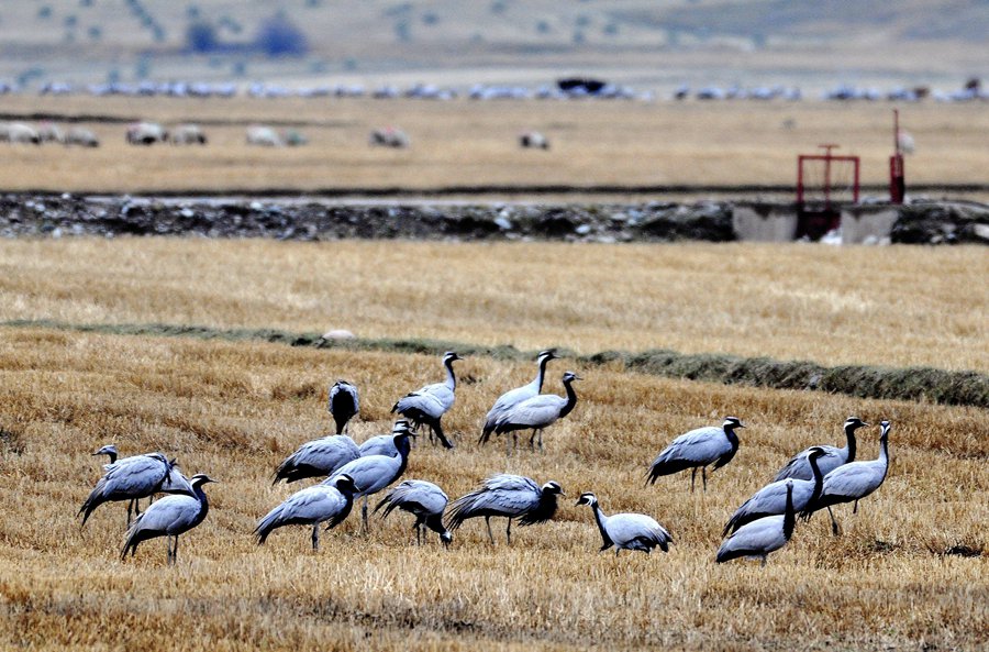 人民網(wǎng)蘭州10月10日電 (記者高翔)寒露至、候鳥遷,甘肅省肅南裕固族自治縣皇城鎮(zhèn)夏日塔拉草原迎來(lái)數(shù)千只蓑羽鶴,它們?cè)跐竦氐乃嫔?、草叢中或悠閑覓食、或蹁躚起舞,與色彩斑斕的草原構(gòu)成了一幅和諧優(yōu)美的生態(tài)畫卷。