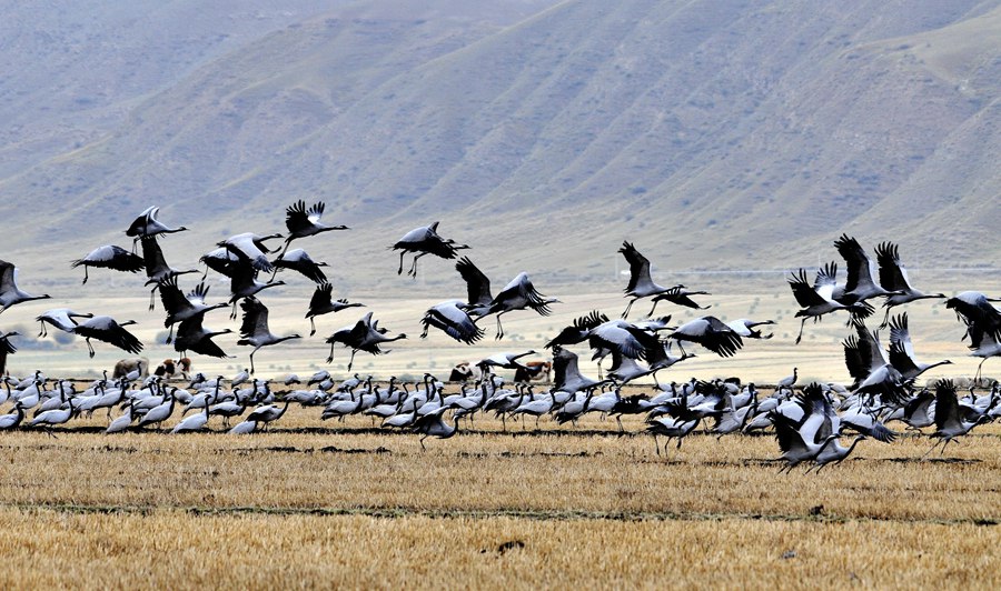 靈動(dòng)!大批蓑羽鶴祁連山下起舞