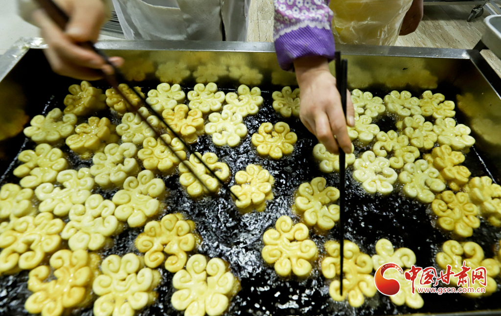 據(jù)悉,春節(jié)前炸“糖花子”是山丹縣的傳統(tǒng)習(xí)俗,至今已有百年歷史。“油炸糖花子”用醒發(fā)后的面餅切成寬約六厘米,長(zhǎng)約九厘米的長(zhǎng)方形,中間再切通三道裂縫,用手翻成圖案花狀,下油鍋緩煎慢炸。炸好的糖花黃中透紅,酥脆香甜,成為春節(jié)待客的頭等美食。