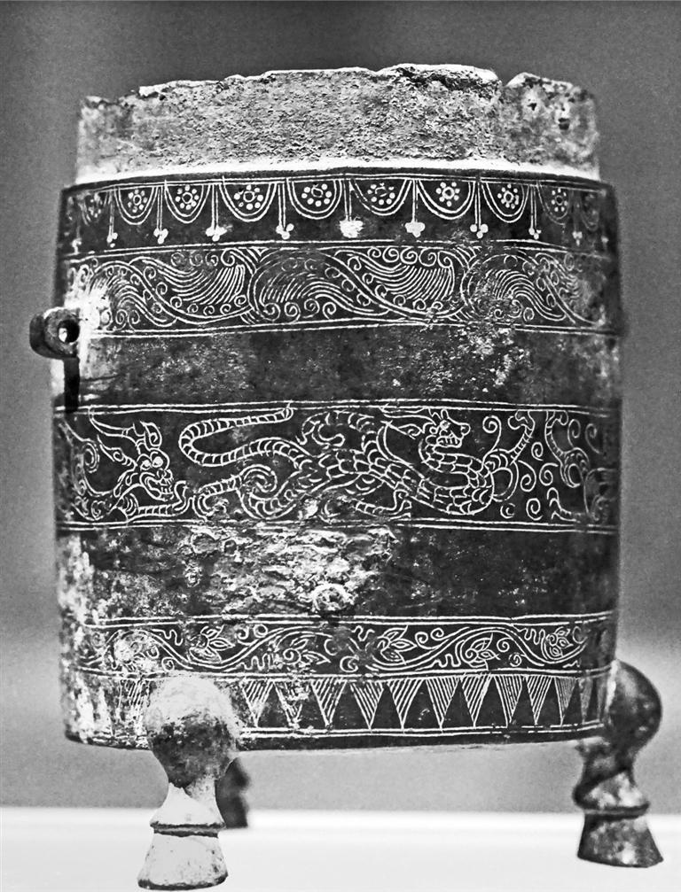 這件金錯(cuò)泥筩,是目前發(fā)現(xiàn)的唯一一件可以確定的、與前涼張氏王族有關(guān)的宮廷用器。征集于西安,可能是公元376年,前涼末主張?zhí)戾a投降前秦后前往長安時(shí)帶去的。