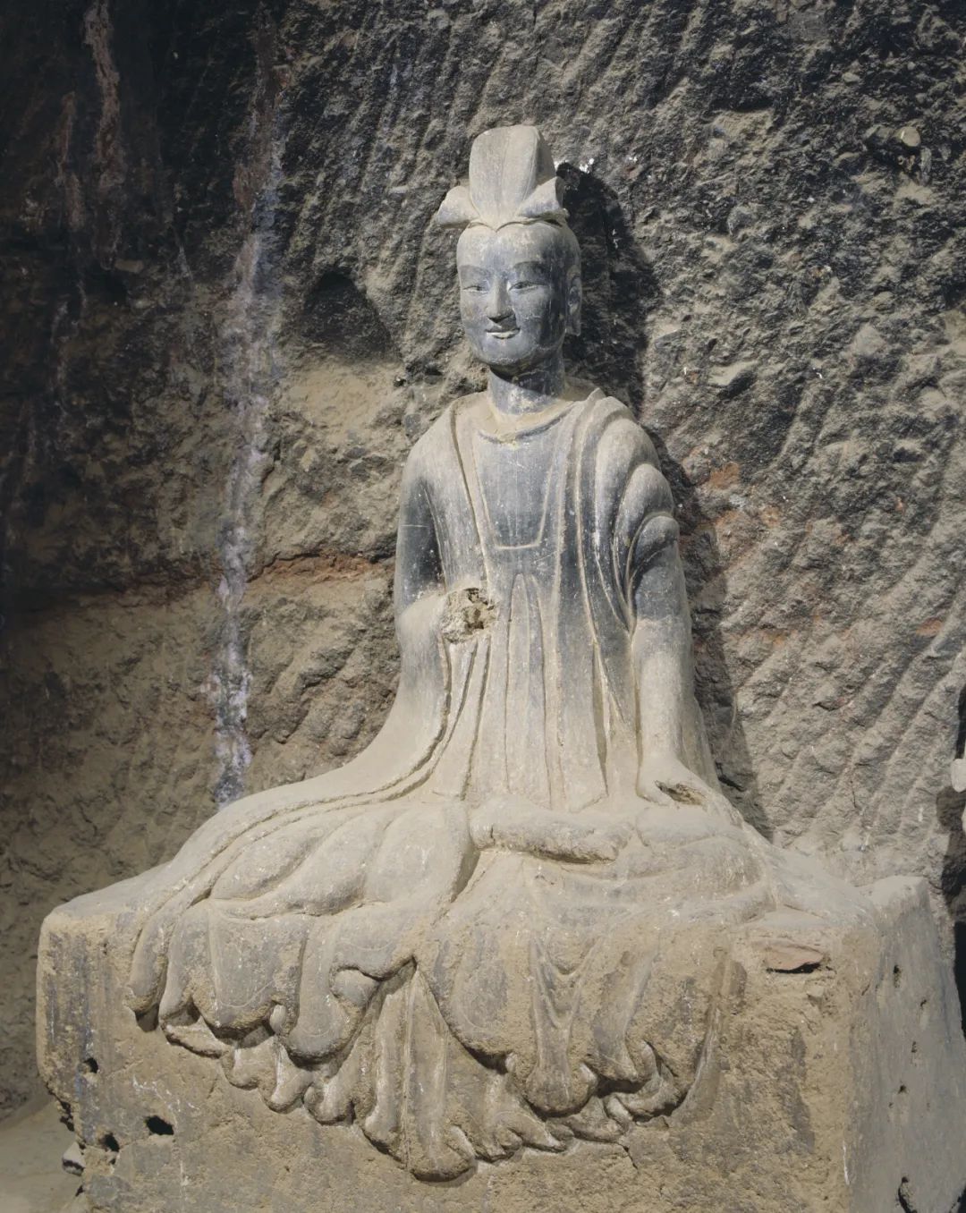特別是佛像發(fā)髻和衣裾方面的變化尤為突出:樣式豐富的渦旋紋、水波紋和螺紋發(fā)髻交相輝映,八字形重疊衣裾和三片式衣裾并存,生動再現(xiàn)了當(dāng)時南朝與中原地區(qū)不同佛教造像藝術(shù)樣式的交流與融合。