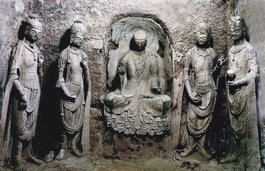 它一改西魏造像繁縟華麗、服飾厚重的特點,無論是佛、菩薩、弟子,還是飛天和力士,服飾輕柔而貼體,均展現(xiàn)出一種雄健挺拔、恬靜自然的氣韻,面相方圓,五官清秀而緊湊。佛低平肉髻,身穿圓領(lǐng)通肩或垂領(lǐng)式袈裟,衣裾下擺緊貼佛座,陰刻圓潤流暢的褶皺紋。菩薩也由束發(fā)高髻改為頭戴花冠,周身飾瓔珞,體姿婀娜而不失端莊。