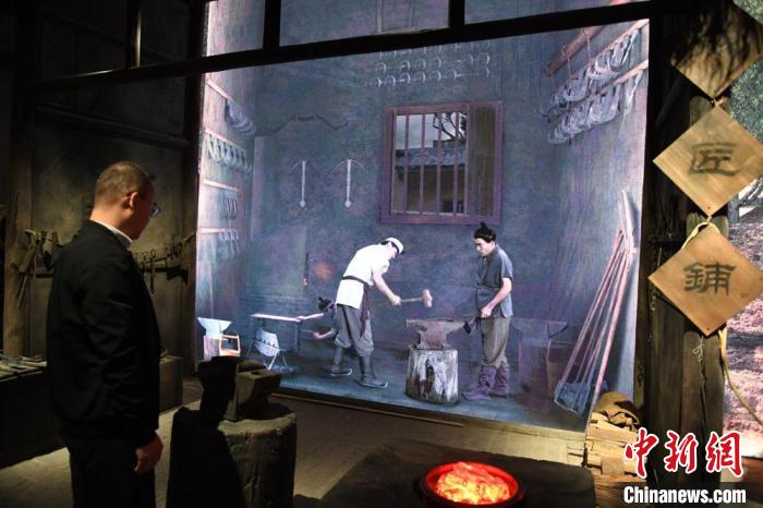 圖為游客在大漢賦館內參觀鐵匠鋪。 戴文昌 攝