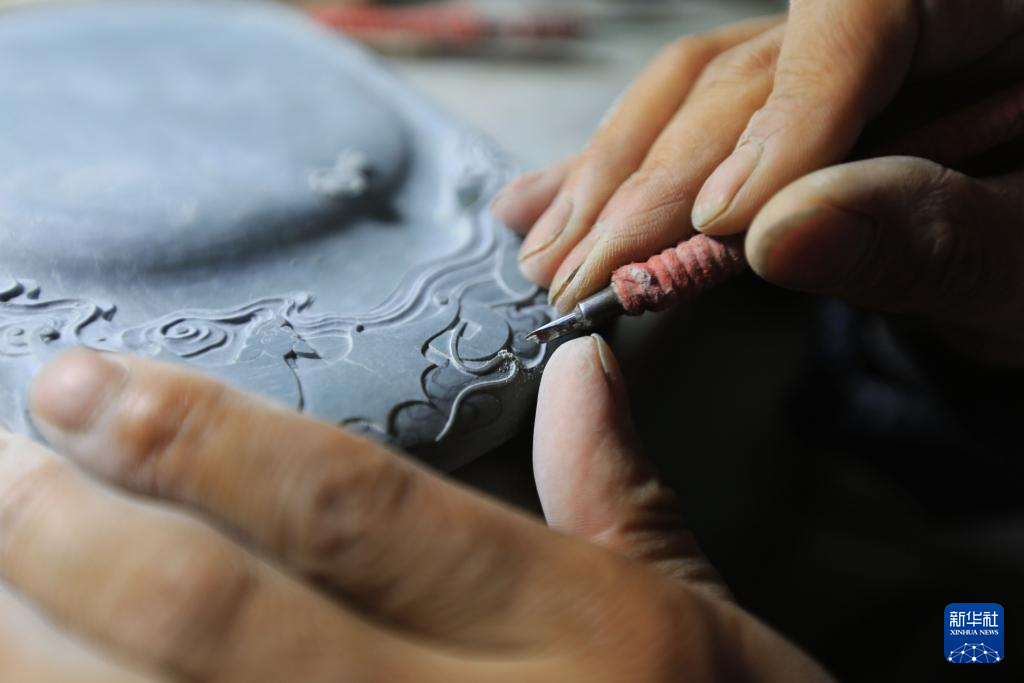 10月24日,藝人在甘肅省定西市臨洮縣洮硯藝術(shù)館雕刻制作洮硯。新華社發(fā)(王克賢 攝)