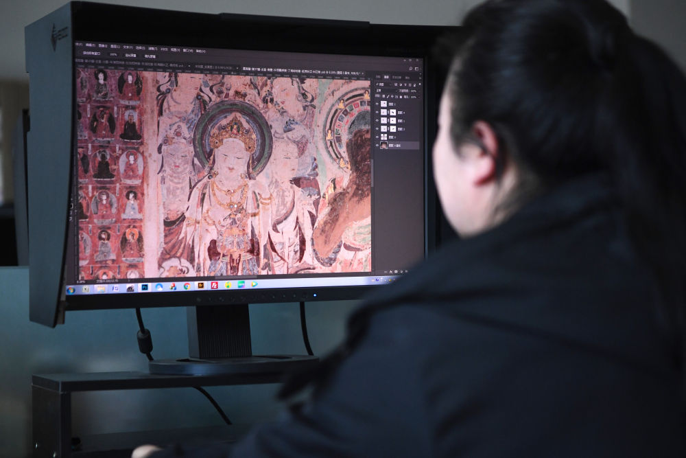 敦煌研究院文物數(shù)字化保護團隊圖像處理人員年海麗在拼接壁畫圖像(2023年4月25日攝)。新華社記者 陳斌 攝