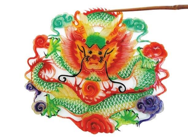 國家級非物質(zhì)文化遺產(chǎn)項目——皮影戲(環(huán)縣道情皮影戲)代表性傳承人高清旺,以當?shù)剜l(xiāng)土風情為素材,選用優(yōu)質(zhì)牛皮,經(jīng)過炮制牛皮、畫好樣稿、陰陽雕刻、顏料上色、燙熨出水、裝訂完成等雕刻工藝流程,制作成了龍年大吉圖案。