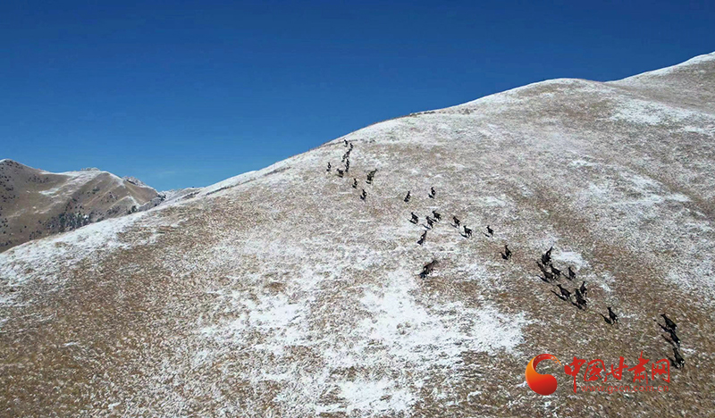 春日的祁連山仍有積雪覆蓋,大種群馬鹿沿著山坡覓食前行,時(shí)而漫步,時(shí)而奔跑,場(chǎng)面非常壯觀,成為保護(hù)區(qū)一道靚麗風(fēng)景,也給寂靜的山嶺增添了生機(jī)與活力。