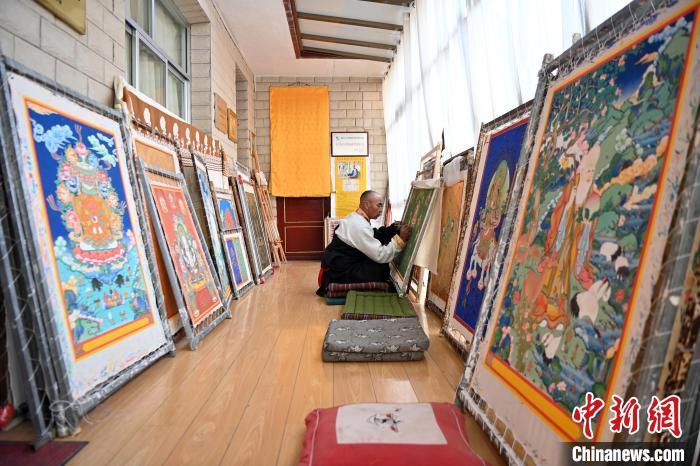 交巴加布的唐卡作品涵蓋了布面彩繪唐卡、珍珠唐卡、刺繪唐卡、織錦唐卡等10余種類型。他在唐卡著色、暈染、勾線、上色等方面都有很深的造詣,使得他的作品色彩鮮艷、線條流暢、構(gòu)圖巧妙,充滿了藝術(shù)魅力。圖為交巴加布在個(gè)人工作室展示繪制的小唐卡。九美旦增 攝