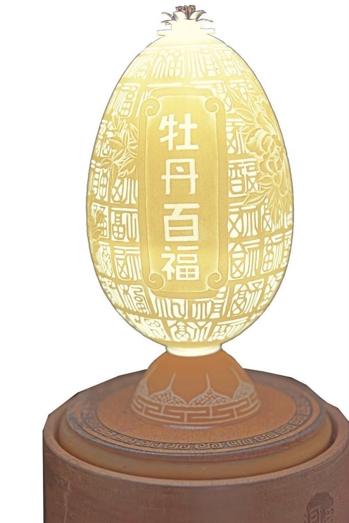 楊星國雕刻過的作品達(dá)兩千多件,作品《牡丹亭》是他用最新的拼雕手法創(chuàng)作的,鴕鳥蛋殼細(xì)分成300片,打磨成“瓦片”樣,逐片貼成古建筑中亭頂蓋狀,形成牡丹亭之樣,做成外層的“亭”;內(nèi)層的“牡丹”則用鴯鹋蛋殼,利用其自然色,依照牡丹層層雕透,第一層深墨、第二層墨綠、第三層淡綠、第四層白色從外到內(nèi)雕刻,作品既有國畫的神韻又有雕刻的立體藝術(shù)之美。浮雕、陰雕、陽雕、鏤空雕、拼雕等手法,在《牡丹亭》作品里全部顯現(xiàn)。為了讓作品表達(dá)的效果更充分,楊星國又加了一些機械原理讓其旋轉(zhuǎn),還加了燈光,于是,3個鴕鳥蛋殼與1個鴯鹋蛋殼在楊星國的巧妙構(gòu)思中有了全新的生命。