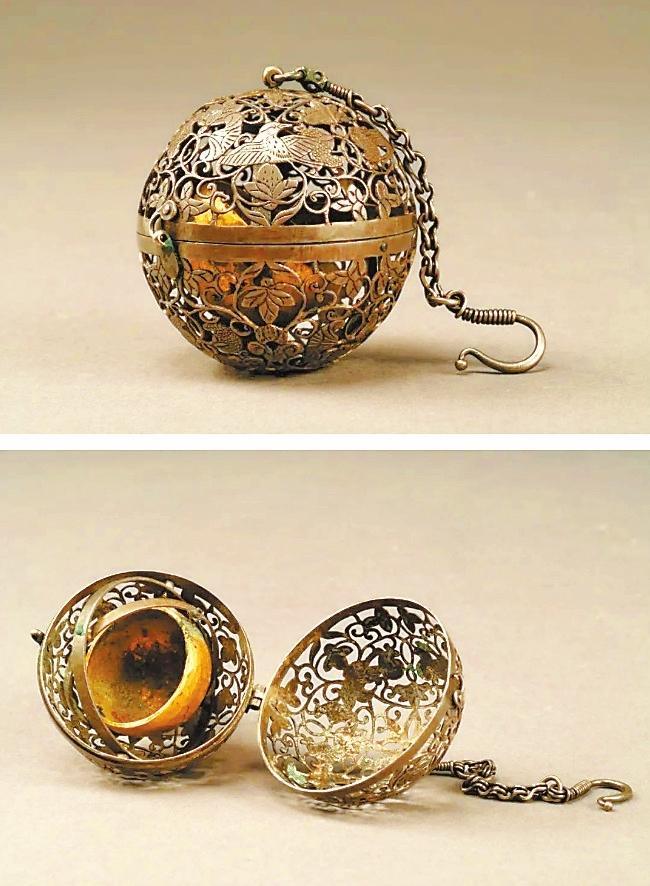 香囊最出彩的地方是機(jī)環(huán)常平架技術(shù),是一種利用球體內(nèi)兩個(gè)同心機(jī)環(huán)與中央焚香盂之間的重力作用,使其在自由轉(zhuǎn)動(dòng)的時(shí)候,始終能保持平衡的機(jī)械原理。唐代的香囊豐富多樣,這種金屬造型的香囊設(shè)計(jì)更為機(jī)巧精致,深受妃后、貴婦們所推崇喜愛(ài),它上承漢代的常平架技術(shù),下延現(xiàn)代陀螺儀萬(wàn)向支架技術(shù),是中國(guó)古代科學(xué)技術(shù)與手工藝技術(shù)對(duì)世界的杰出貢獻(xiàn)。