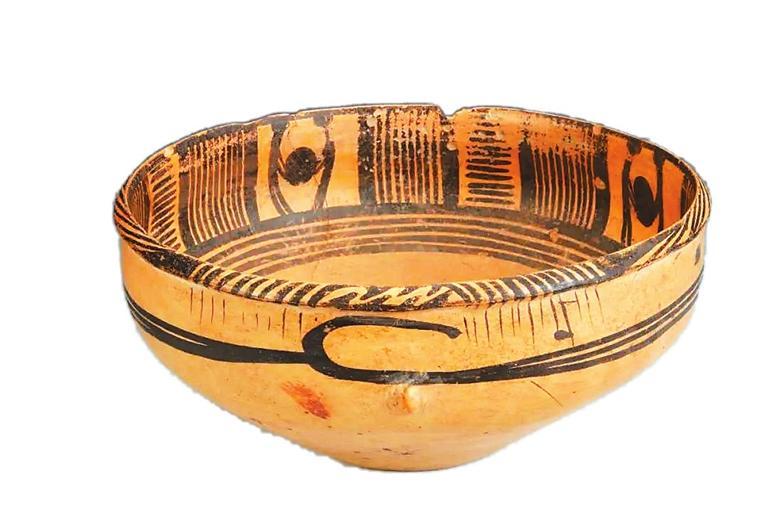 這件距今5000多年的古代彩陶作品,制作精致,圖案精美,人物形體鮮明,造型和動(dòng)作既抽象又生動(dòng)。彩陶盆通高11.3厘米,口徑24.5厘米,底徑9.8厘米,細(xì)泥制作,唇外侈,略鼓腹,腹部?jī)蓚?cè)有對(duì)稱的小鈕。口沿內(nèi)壁為四組雙人抬物圖案,中間以橫豎線條組成的幾何圖案間隔,形成一周四方連續(xù)的紋飾帶,繪制于陶盆內(nèi)側(cè)上部,二人的頭部以圓點(diǎn)代表,軀干和四肢以線條描繪。兩人相向站立,共同抬起一個(gè)碩大的圓形物體,畫面簡(jiǎn)潔而生動(dòng),寥寥數(shù)筆就將人抬重物時(shí)雙腿開立、腰背微屈用力的形態(tài)刻畫得惟妙惟肖。陶盆上精妙的紋飾讓它成為我國(guó)最早在彩陶上表現(xiàn)原始先民勞作場(chǎng)景的藝術(shù)珍品。