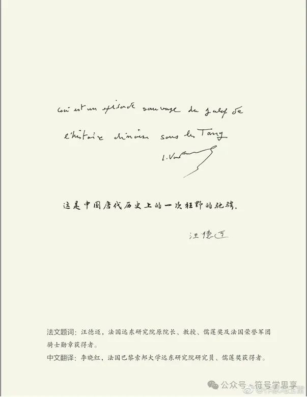 汪德邁先生對于馮玉雷這部作品給予高度評價,2018年專門題辭:“這是中國唐代歷史上的一次狂野的馳騁。”馮教授專門把汪德邁先生給他的法文與中文題辭作為題簽印在書封面上,他多次跟我說:“幸遇汪德邁教授、李曉紅教授,受益良多,感激之情,難以言表。”