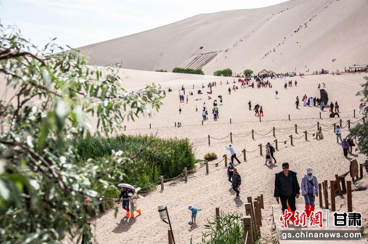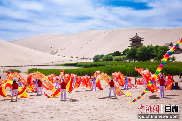 6月10日,敦煌市鳴沙山下,一場以敦煌市舞龍隊(duì)為首的20個(gè)健身舞蹈隊(duì)為廣大市民和游客獻(xiàn)上一臺(tái)臺(tái)精彩的舞蹈盛宴,吸引了眾多游客圍觀、拍照,在敦煌大漠度過一個(gè)難忘的端午節(jié)。王斌銀 攝