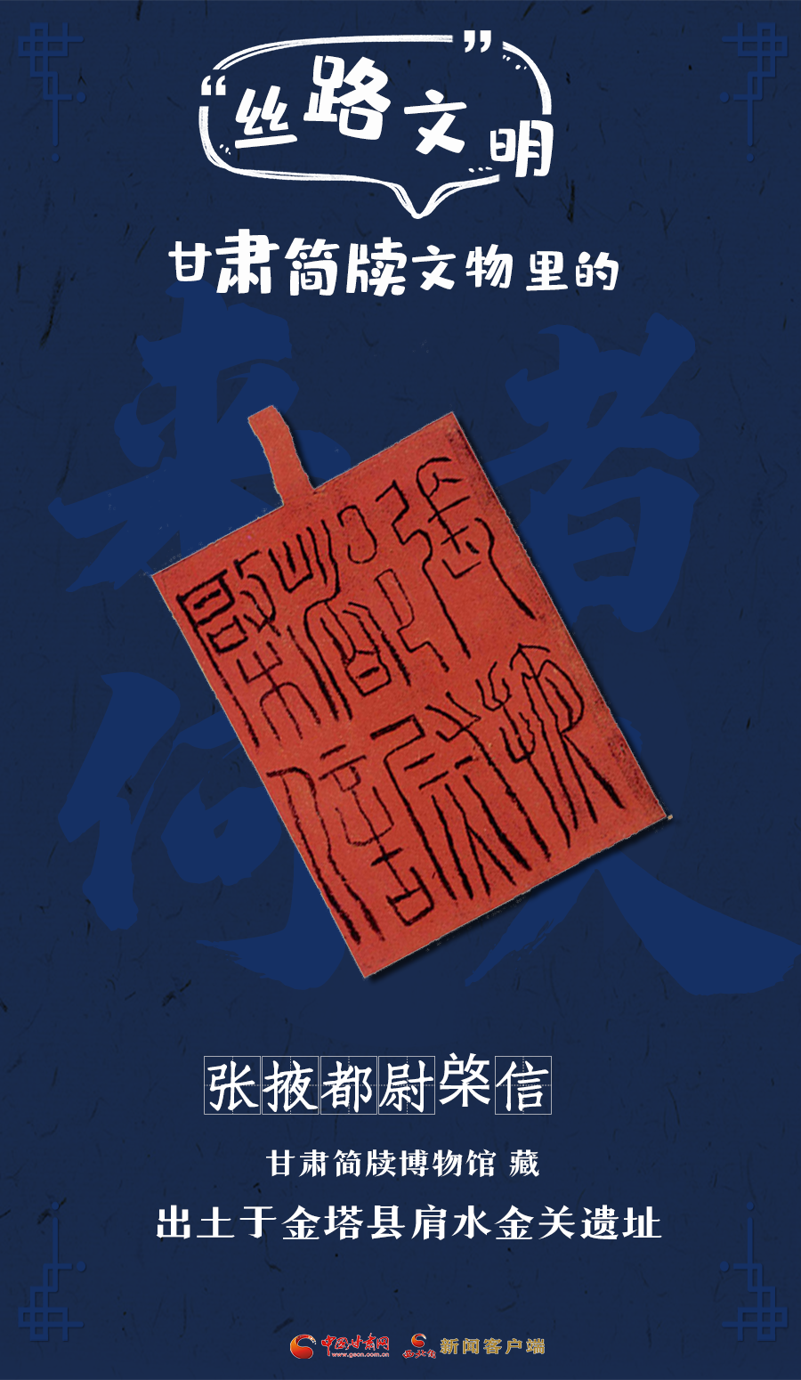 上方綴系,墨筆篆書“張掖都尉棨信”六字。文字簡(jiǎn)明,應(yīng)屬于幡信之類