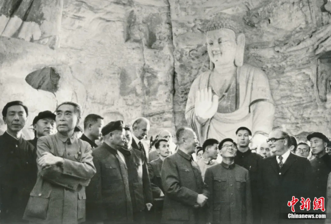 1973年9月15日,周恩來總理陪同時任法國總統(tǒng)喬治·蓬皮杜視察云岡石窟。云岡研究院 供圖