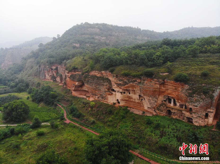 7月15日,航拍甘肅省平?jīng)鍪袥艽h百里石窟長廊中的羅漢洞石窟。百里石窟長廊位于涇川縣境內(nèi),由512個(gè)石窟、5眼窟中石井組成,現(xiàn)存王母宮石窟、鳳凰山石窟、南石窟寺、丈八寺石窟、羅漢洞石窟、太山寺石窟等規(guī)模較大的石窟群,還有數(shù)量眾多的小石窟群。羅漢洞石窟遺存40余個(gè)窟龕,以北魏至清代風(fēng)格為主。(無人機(jī)照片) 中新社記者 李亞龍 攝