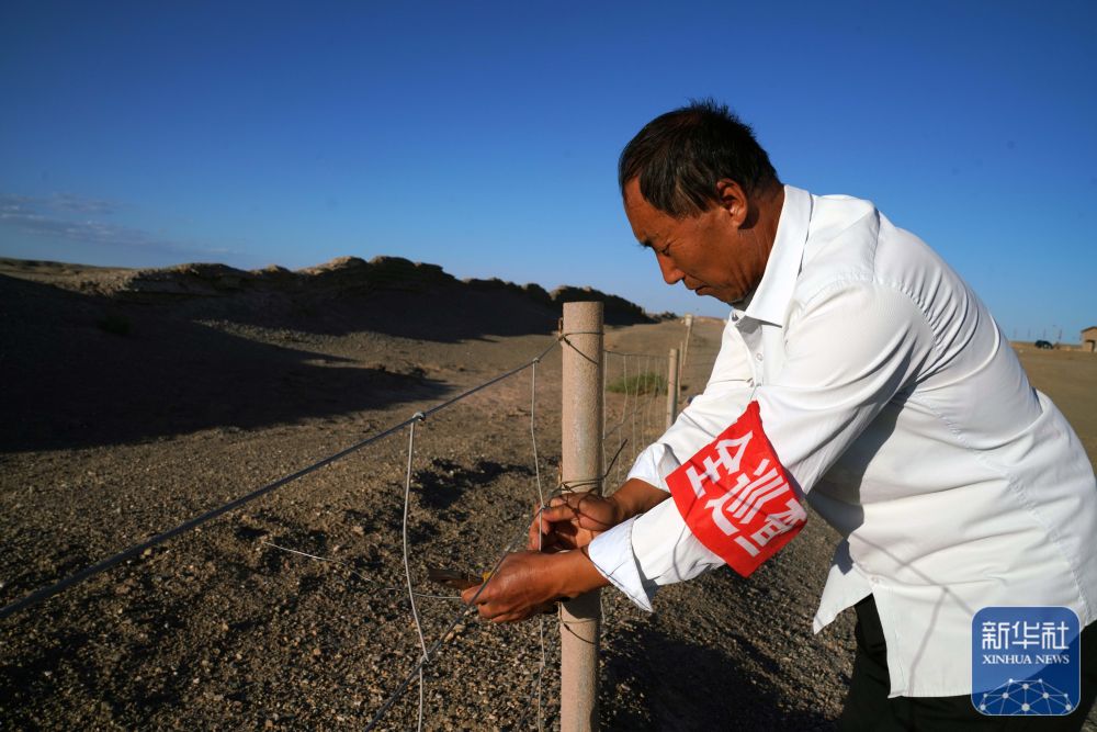 ↑7月16日,張吉全沿著漢長(zhǎng)城巡護(hù)時(shí)加固防護(hù)欄。