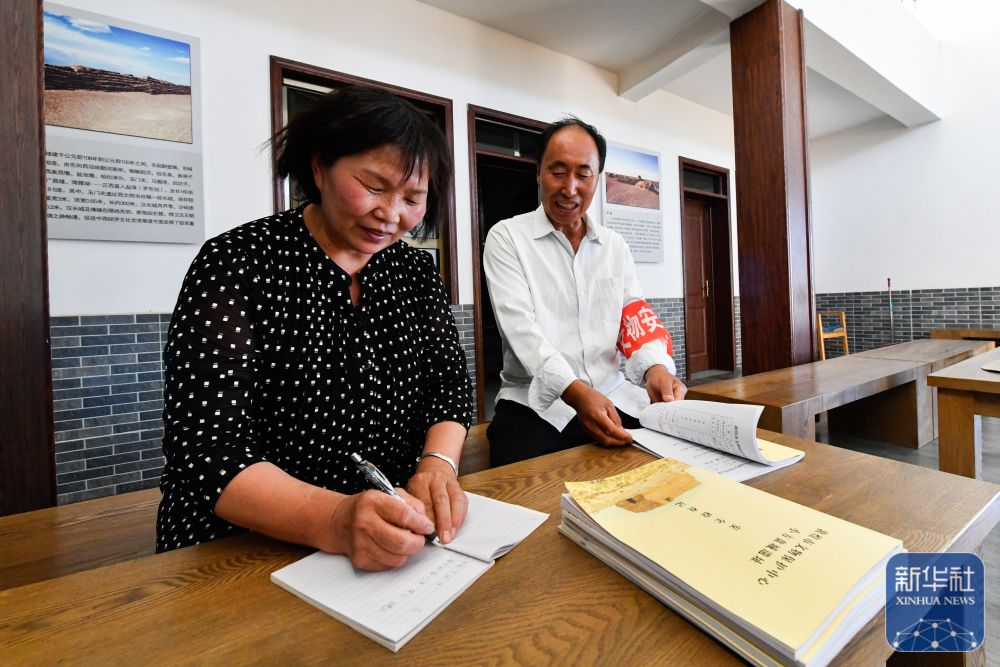 ↑7月16日,張吉全和聞春瑜在漢長(zhǎng)城文物保護(hù)管理用房?jī)?nèi)寫(xiě)巡護(hù)日記。