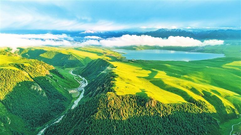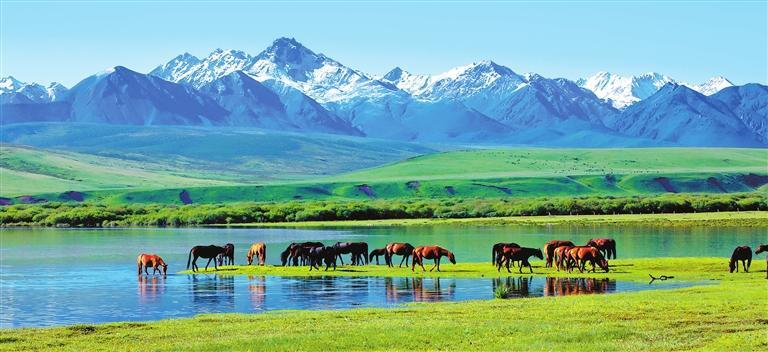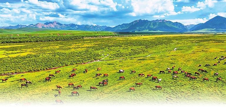 白雪皚皚的祁連山下,一眼望不到邊的大片牧草青翠碧綠,色彩斑斕的野花競相開放,擁有百萬畝草原的山丹馬場如巨幅彩色畫卷徐徐展開。