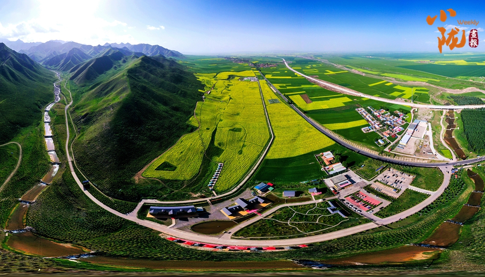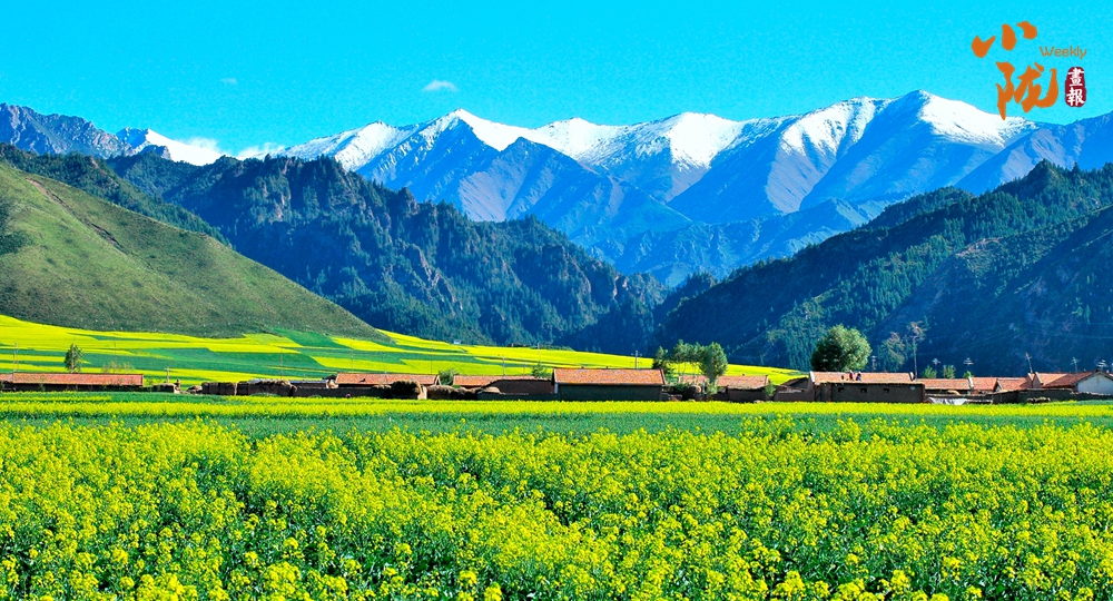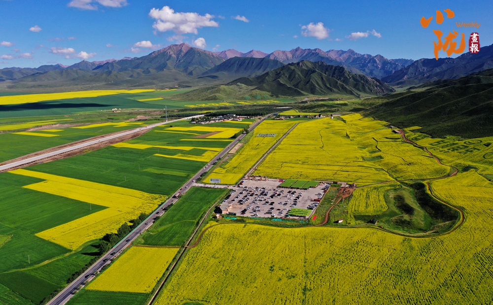 在藍天白云和祁連雪峰的映襯下,那盛開的油菜花、點綴在花海中的村莊人家,勾勒出一幅優(yōu)美的田園風光畫卷。