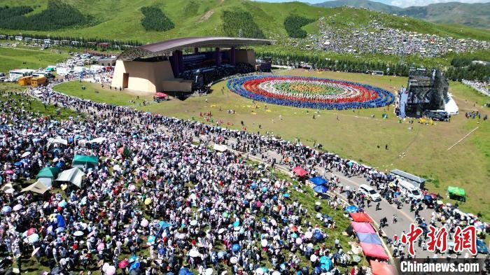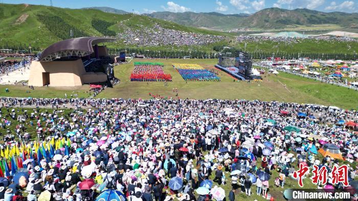 8月4日,第22屆九色甘南香巴拉旅游藝術(shù)節(jié)在甘肅省甘南藏族自治州當(dāng)周草原開幕。人們身著節(jié)日盛裝載歌載舞、歡聚一堂,馬隊(duì)巡游、千人鍋莊舞等活動(dòng)精彩上演。九色甘南香巴拉旅游藝術(shù)節(jié)既是民眾浪山聚會(huì)的節(jié)日盛會(huì),也是展現(xiàn)發(fā)展成就、擴(kuò)大對(duì)外開放的重要窗口,更是展示民俗文化、促進(jìn)廣泛交往交流交融的有效載體。圖為開幕式現(xiàn)場(chǎng)千人鍋莊舞表演。(無(wú)人機(jī)照片)中新社記者 九美旦增 攝