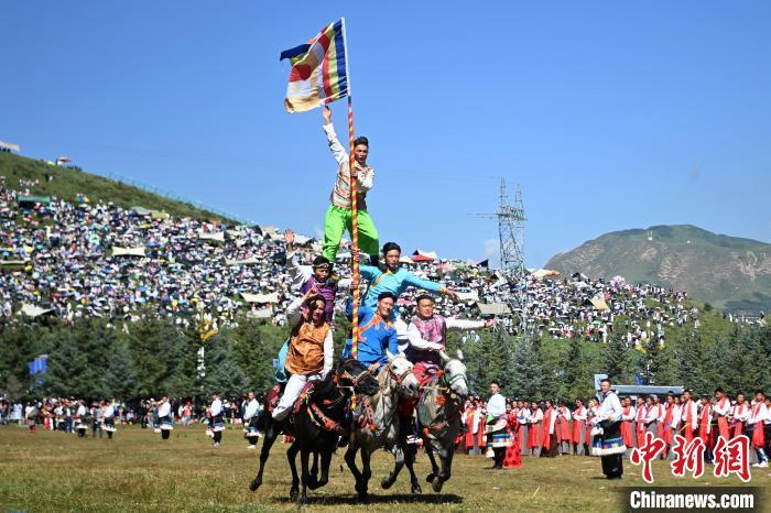 8月4日,藏族騎手在當(dāng)周草原上表演馬隊(duì)巡游。當(dāng)日,第22屆九色甘南香巴拉旅游藝術(shù)節(jié)在甘肅省甘南藏族自治州當(dāng)周草原開幕。人們身著節(jié)日盛裝載歌載舞、歡聚一堂,馬隊(duì)巡游、千人鍋莊舞等活動(dòng)精彩上演。九色甘南香巴拉旅游藝術(shù)節(jié)既是民眾浪山聚會(huì)的節(jié)日盛會(huì),也是展現(xiàn)發(fā)展成就、擴(kuò)大對(duì)外開放的重要窗口,更是展示民俗文化、促進(jìn)廣泛交往交流交融的有效載體。中新社記者 九美旦增 攝