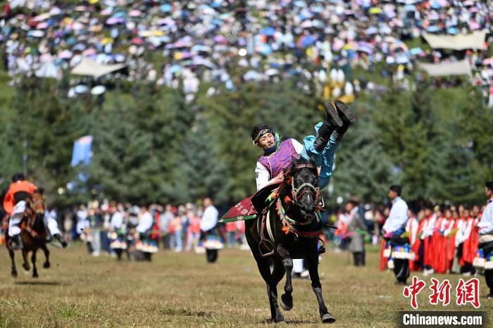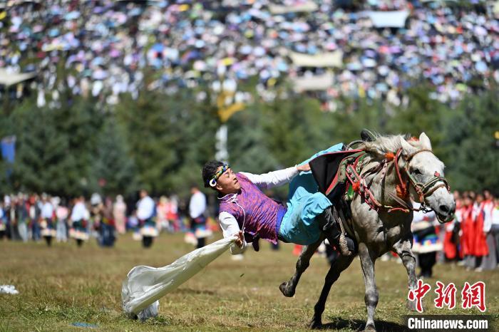 8月4日,藏族騎手在當(dāng)周草原上表演馬術(shù)。當(dāng)日,第22屆九色甘南香巴拉旅游藝術(shù)節(jié)在甘肅省甘南藏族自治州當(dāng)周草原開幕。人們身著節(jié)日盛裝載歌載舞、歡聚一堂,馬隊(duì)巡游、千人鍋莊舞等活動(dòng)精彩上演。九色甘南香巴拉旅游藝術(shù)節(jié)既是民眾浪山聚會(huì)的節(jié)日盛會(huì),也是展現(xiàn)發(fā)展成就、擴(kuò)大對(duì)外開放的重要窗口,更是展示民俗文化、促進(jìn)廣泛交往交流交融的有效載體。中新社記者 九美旦增 攝