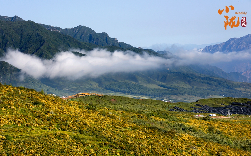 放眼望去,群山連綿,綠意盎然,萬千金星灑滿綠毯,牛羊踩著山的脊梁品讀夏日的詩行,幾朵白云橫臥于山頂,觸手可及。