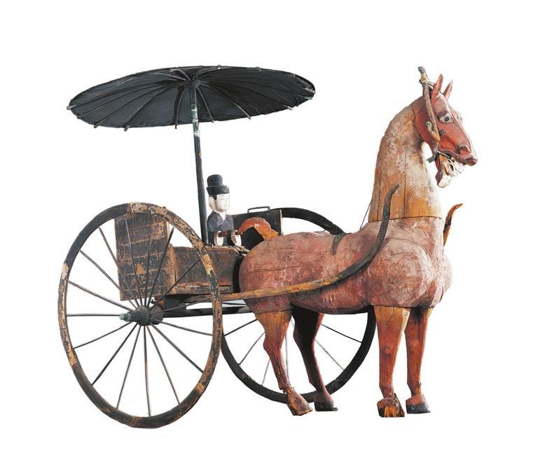 彩繪木軺車(chē),西漢,武威磨嘴子出土。軺車(chē)由輿車(chē)、傘蓋、御奴和馬組成,是迄今為止發(fā)現(xiàn)最大的漢代木雕作品,也是現(xiàn)存漢代木軺車(chē)馬保存較為完好的一件,對(duì)于研究漢代車(chē)輿和封建等級(jí)制度提供了極為難得的資料。據(jù)漢代制度,推斷墓主人生前為六百石至千石的官吏。
