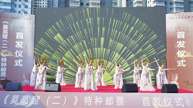 敦煌文化博大精深,敦煌舞蹈美輪美奐。首發(fā)儀式上,舞者身著飄逸的古裝,頭戴華麗的發(fā)飾,手持飄帶,仿佛從天而降的仙子。她們?cè)谝魳?lè)的伴奏下,翩翩起舞,輕盈如燕,婉約如風(fēng),一曲《千手觀音》拉開(kāi)了《莫高窟(二)》特種郵票發(fā)行儀式的序幕。