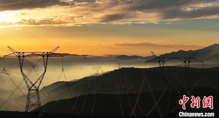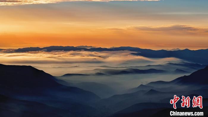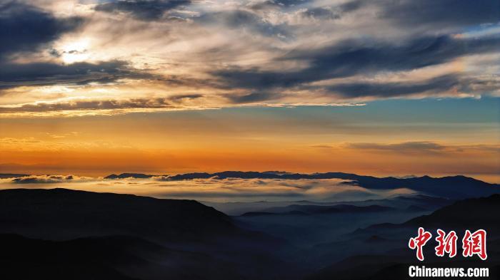 8月14日晚,蘭州市榆中縣馬坡鄉(xiāng),夕陽在云海里翻滾,映照大地和村莊城鎮(zhèn),美不勝收。圖為云海日落籠罩黛青色山脈。丁永睿 攝